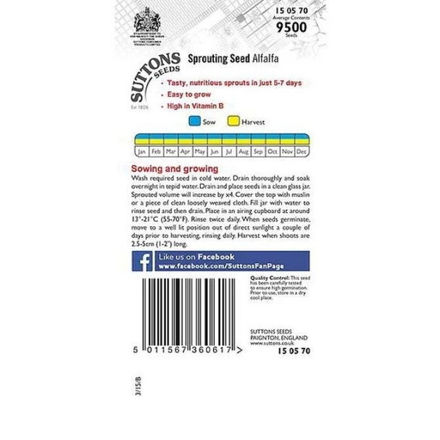 Suttons Alfalfa seeds are a pack of nutritious sprouting seeds that grow into tender, sweet shoots with a mild, pea-like flavour — perfect for adding to salads, sandwiches or smoothies. These easy-to-grow sprouts can be ready to harvest in about 5–7 days and are packed with flavour and nutrients, making them great for home growers with limited space like windowsills or balconies.