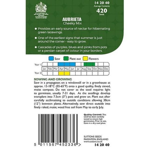 Suttons Aubrieta ‘Cheeky Mix’ is a hardy perennial flower seed mix that produces a carpet of vibrant, multi-coloured blooms in spring, perfect for adding long-lasting colour to rockeries, banks, walls and borders with low-growing, spreading plants. These tough little plants hug the ground at about 10 cm (4 in) tall and are easy to grow from seed, bringing cheerful spring interest and making a great early nectar source for bees and other pollinators.