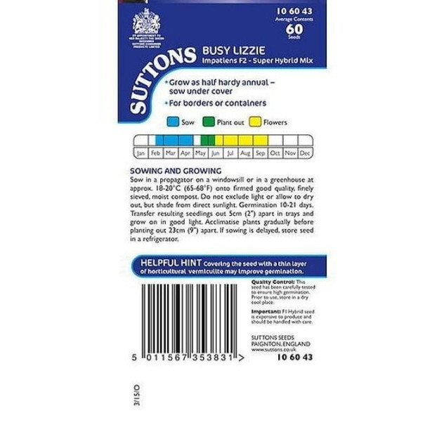 Suttons Busy Lizzie Value Hybrids – Impatiens is a compact and large-flowering annual seed mix of classic Busy Lizzie (Impatiens) plants that produces a vibrant display of colourful blooms all summer long. Ideal for filling borders, tubs, hanging baskets or patio containers, these versatile, low-growing flowers (about 15 cm/6″ tall) add long-lasting colour in sun or partial shade, making them a cheerful, easy-to-grow choice for summer gardens.