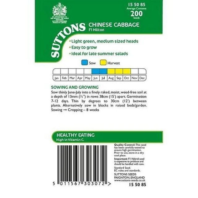 Suttons Chinese Cabbage Hilton is an easy-to-grow Chinese cabbage seed variety that produces light green, medium-sized, barrel-shaped heads of crunchy, delicious leaves perfect for fresh salads, stir-fries or Asian-inspired dishes. This cool-season vegetable develops quickly from sowing to harvest in about 8 weeks, offering home gardeners a tasty and versatile crop with crisp texture and mild flavour.