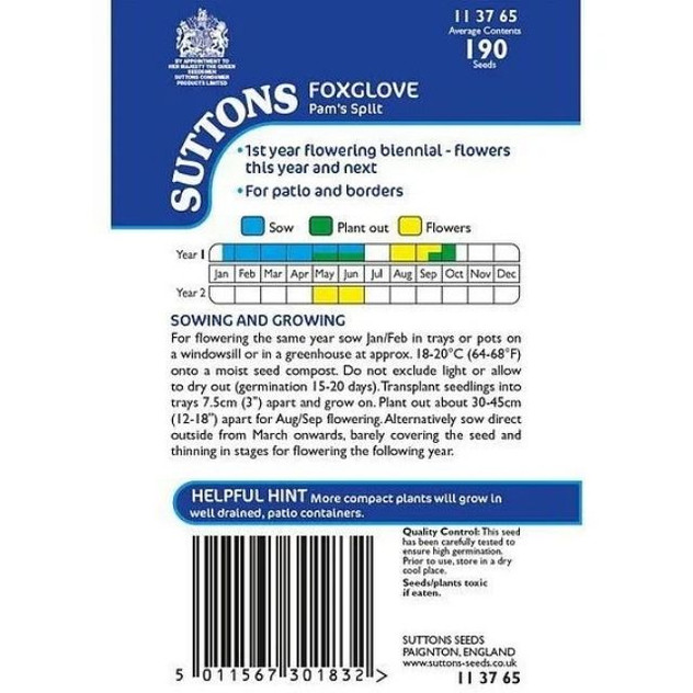 Suttons Foxglove Pam’s Split is a striking biennial flower seed variety that produces tall, architectural spikes of creamy-white blooms accented with bold burgundy blotches and unusually split lower petals for an open, ruffled look. Growing around 120–140 cm (4–4 ½ ft) tall, these elegant foxgloves add vertical interest to borders and cottage gardens and are attractive to beneficial insects and pollinators. Easy to grow from seed sown early in the year, they bring a dramatic display to summer beds and wildflower plantings.