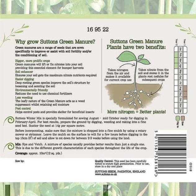 Suttons Green Manure Winter Mix is a specially formulated seed blend designed to be sown from late summer into autumn to protect and improve your soil over the winter months. It contains hardy green manure species such as rye and vetch that establish quickly, help fix nutrients like nitrogen, suppress weeds and pests, and improve soil structure by loosening and aerating while you’re not growing a crop. In spring, you can dig the plants back into the soil to enrich fertility and prepare your beds for the next season’s planting.