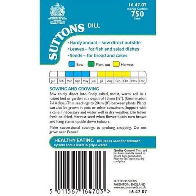Suttons Herbs Dill is a fast-growing annual herb seed variety that produces feathery, bright green foliage with a fresh, aromatic, slightly citrus-anise flavour — ideal for seasoning fish, pickles, salads and creamy sauces. Easy to sow directly into beds or containers from spring onwards, dill thrives in well-drained soil and can be harvested continually as the plant grows, with seeds later usable as a spice too.
