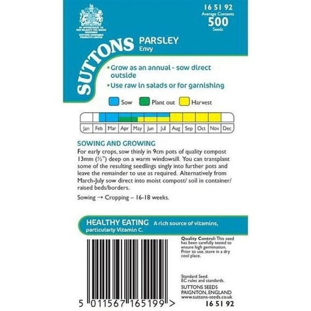 Suttons Herbs Parsley Envy is a classic herb seed variety that grows into vigorous plants with densely curled, dark green foliage — making it a striking and productive addition to any kitchen garden or pot on a sunny windowsill. Ideal for fresh use in salads, garnishes and a wide range of dishes, this parsley is easy to sow directly or in containers.