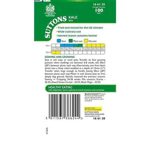 Suttons Kale Mix is a packet of mixed kale seeds that grow into a variety of robust, leafy greens in different colours and textures, perfect for adding nutritious, versatile vegetables to your garden. These hardy biennials — often including curly and ornamental types — are easy to grow in beds or containers and can be harvested over a long season for salads, sautés and soups. With attractive foliage as well as great flavour, this mix brings both ornamental charm and healthy eating to your outdoor space.