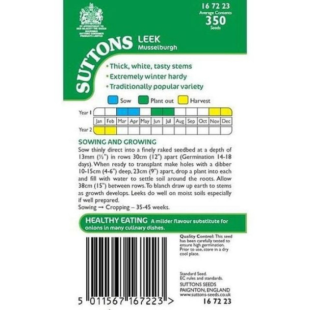 Suttons Leek Musselburgh is a reliable and vigorous leek variety that produces thick, white stems with crisp, mild-flavoured green tops — ideal for soups, stir-fries, casseroles and classic leek-and-potato dishes. Suited to sowing in spring and growing on into summer and autumn, these hardy vegetables are great for garden beds or allotments and deliver dependable yields of tasty, home-grown leeks for fresh cooking.