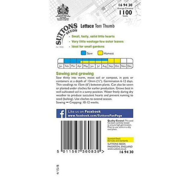 Suttons Lettuce Tom Thumb is a compact, early-maturing lettuce seed variety that produces tight, solid little heads ideal for small gardens, containers, patios or windowsills. The dwarf plants form small, crisp hearts with minimal outer leaves, making them quick and easy to grow with minimal waste — perfect for fresh homegrown salads even in limited spaces. This variety typically goes from sowing to harvest in about 10–12 weeks, and is suited to a sunny spot with regular watering.