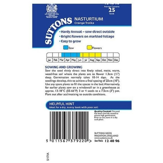 Suttons Nasturtium Troika Orange is a hardy annual flower seed variety that produces vibrant, jewel-like orange blooms set off by attractive marbled foliage, creating a striking display in beds, borders, containers or hanging baskets throughout the summer. The semi-trailing plants stay compact (about 25 cm/10 in tall) while spreading to form colourful ground cover, and the peppery leaves and edible flowers can also be used to add flavour and colour to salads.