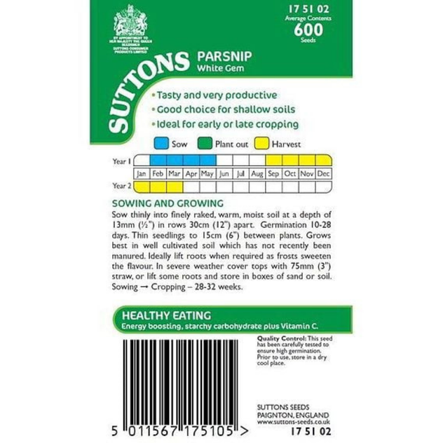 Suttons Parsnip White Gem is a versatile and reliable parsnip seed variety specially bred to perform well in almost all soil types, producing shorter, broad-shouldered roots with smooth, creamy white skin and a sweet, nutty flavour that’s great for roasting, mashing or soups. It has good resistance to canker and is an excellent choice for autumn and winter harvests in home gardens.