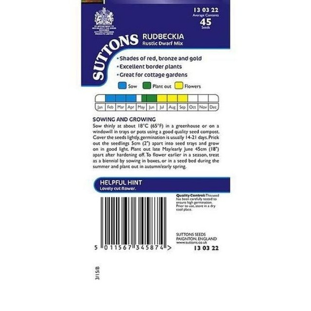 Suttons Rudbeckia Rustic Dwarf Mix is a striking flower seed mix that produces eye-catching daisy-type blooms in rich shades of red, bronze and gold with prominent central discs, perfect for adding bold colour to borders, containers or floral arrangements from mid-summer into early autumn. These half-hardy annual/hardy perennial plants grow to about 50–60 cm (20–24 in) tall and are easy to sow under cover for summer flowering, bringing warm, cottage-garden charm and seasonal interest to sunny garden spots.