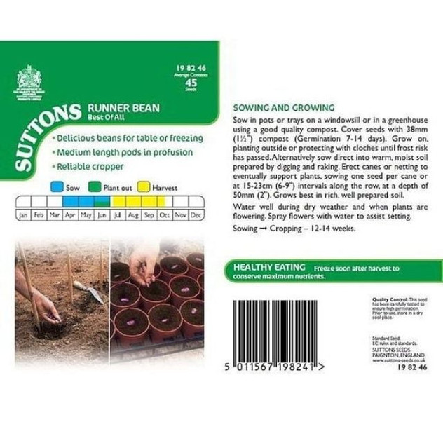 Suttons Runner Bean Best Of All is a heritage vegetable seed variety that produces a heavy crop of delicious, tender runner beans in medium-length pods borne in large clusters throughout the summer. Easy to grow when sown April–June, these prolific climbers thrive in well-cultivated, humus-rich soil and, with regular watering, reward gardeners with a long season of beans perfect for fresh eating or freezing.