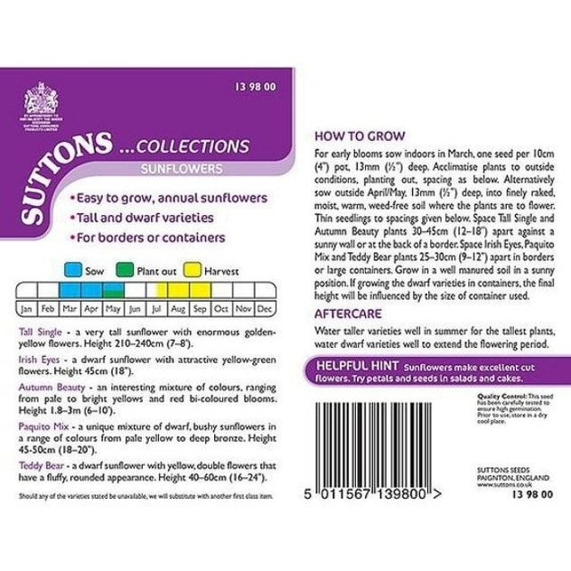 Suttons Sunflower Collection is a cheerful seed pack featuring a mix of five beautiful sunflower varieties that will fill your garden with bold colour and height. The collection includes towering types with giant golden blooms, charming dwarf varieties with yellow-green or fluffy double heads, and colourful mixes that range from pale yellow to rich red tones. Easy to grow as hardy annuals, these sunflowers are great for borders, containers or cutting for bouquets — and a real favourite for gardeners and children alike.