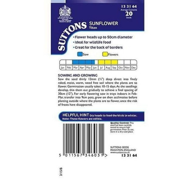 Suttons Sunflower Titan is a classic hardy annual sunflower seed variety that grows into **towering plants up to about 3.5 m (12 ft) tall with **huge, daisy-like yellow flower heads up to around 50 cm (20 in) across, creating a dramatic focal point at the back of borders or in large garden spaces. Easy to grow from seed in full sun, these bold blooms also provide a feast of seeds for wildlife and are great for cutting, and being pollen-free they’re suitable for hayfever sufferers.