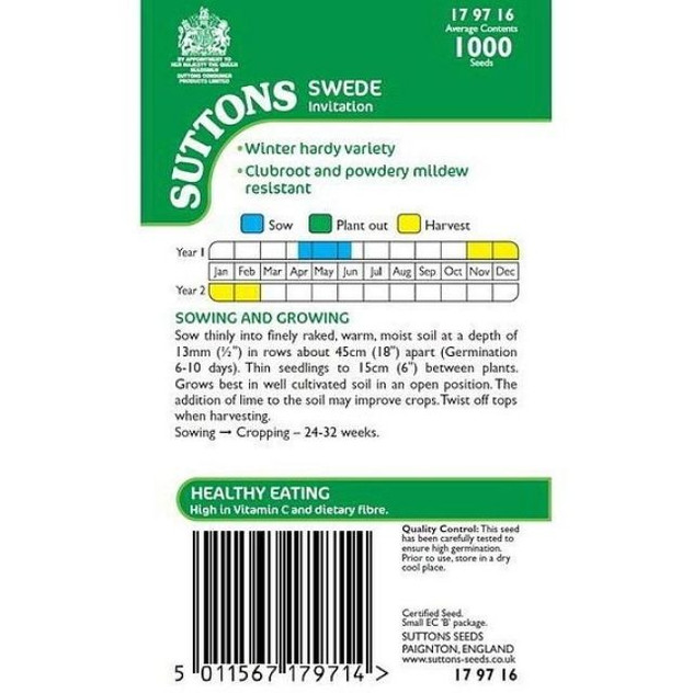 Suttons Swede Invitation is a reliable winter vegetable seed variety that produces strong-growing swede (rutabaga) roots with good resistance to clubroot and powdery mildew, making it hardy and easier to grow even in cooler seasons. It’s well-suited to home gardens and allotments, offering a tasty, winter-hardy crop that can be harvested from late autumn through to early spring, and is often recommended as a great beginner swede variety thanks to its vigour and disease resistance.