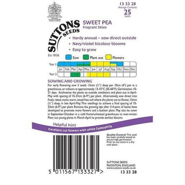 Suttons Sweet Pea Fragrant Skies is an attractive Spencer sweet pea seed variety that produces tall climbers (around 1.8 m/6 ft) with large, highly scented flowers in an elegant blue-toned mix — perfect for garden borders, trellises and cut-flower displays. Easy to grow as a hardy annual from seed, these colourful blooms are both beautiful in the garden and excellent for floral arrangements or showing.