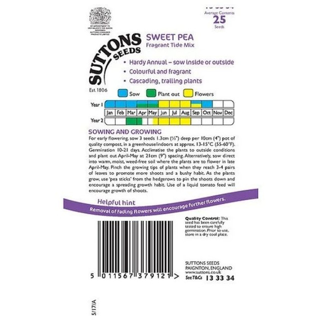 Suttons Sweet Pea Fragrant Tide is a charming sweet pea seed mix that produces a profusion of beautifully coloured, highly fragrant flowers on dwarf, cascading plants perfect for ground-cover planting, containers or low borders. These hardy annuals grow to about 40–45 cm (16–18 in) tall with plenty of blooms from early summer into autumn, filling the garden with scent and colour.