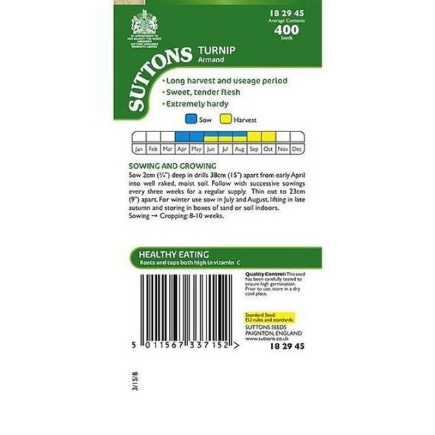 Suttons Turnip Armand is a hardy, versatile turnip variety grown from seed that produces attractive purple-and-white skinned roots with sweet, tender flesh — excellent for cooking and roasting. It can be sown in spring for summer and autumn harvests or later for winter use, thanks to its resilience in colder conditions, giving you a long harvest and usage period from the same patch.
