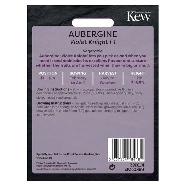 T&M KEW Aubergine Violet Knight F1 is a hybrid vegetable seed variety from the Thompson & Morgan Kew Vegetable range that produces compact, early-maturing aubergines with slender, glossy deep-purple fruits that are deliciously mild and versatile in the kitchen. Well-suited to container growing or greenhouse cultivation, Violet Knight plants are relatively disease-resistant and offer reliable yields of attractive fruit, making them great for both beginner and experienced growers looking to enjoy home-grown eggplants.