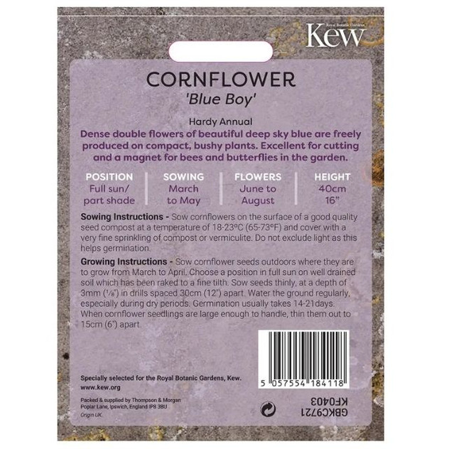 T&M KEW Cornflower (Centaurea cyanus ‘Blue Boy’) is an ornamental annual flower seed variety from the Thompson & Morgan KEW Flowerhouse collection that produces classic cornflower blooms in intense, true blue — a colour prized in cottage gardens and wildflower mixes. These attractive, daisy-like flowers grow on upright stems all summer long and are excellent for cutting, beds, borders or pollinator-friendly plantings, adding vibrant colour and supporting bees and other beneficial insects.