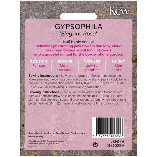 T&M KEW Gypsophila Elegans Rose is a delicate and airy annual flower seed from Thompson & Morgan’s KEW Flowerhouse collection that produces clouds of fine, rose-pink “baby’s breath” blossoms on slender stems — perfect for softening the look of sunny borders, edging beds or adding a light, romantic filler to cut flower bouquets. Easy to grow in well-drained soil and loved by florists and pollinators alike, this hardy annual adds a graceful, mist-like texture and subtle colour to your garden from summer into autumn.